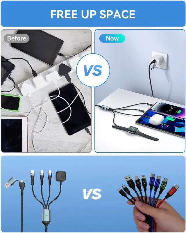 ?? 4 in 2 Multi Charging Cable Simplify Your Charging RoutineMeet the 4 in 2 multi charging cable that replaces every other cord. Equipped with four output ports a 100W USB? C for laptops/phones a 12W USB? C a Lightning connector and a magnetic Watch charger it powers all your essential devices at once. Dual USB? A/USB? C inputs make it universally compatible with adapters or power banks for travel office or home.? True 100W PD Charging Built for Laptops and BeyondDesigned for performance the multi charging cable 100w supports Power Delivery for high? power devices like MacBook Pro XPS and iPad Pro.