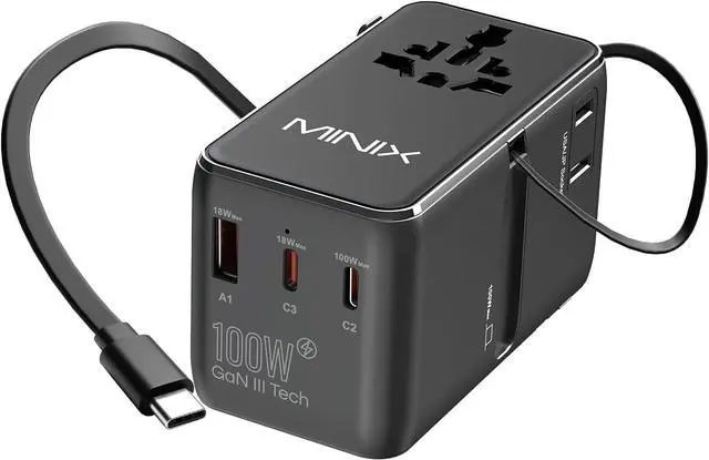 Total Dc Output: 100W)100W USB-C Retractable CableThe MINIX international plug adapter boasts a maximum power output of 100W via its integrated retractable USB-C cable.