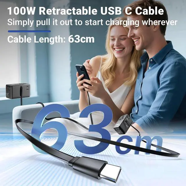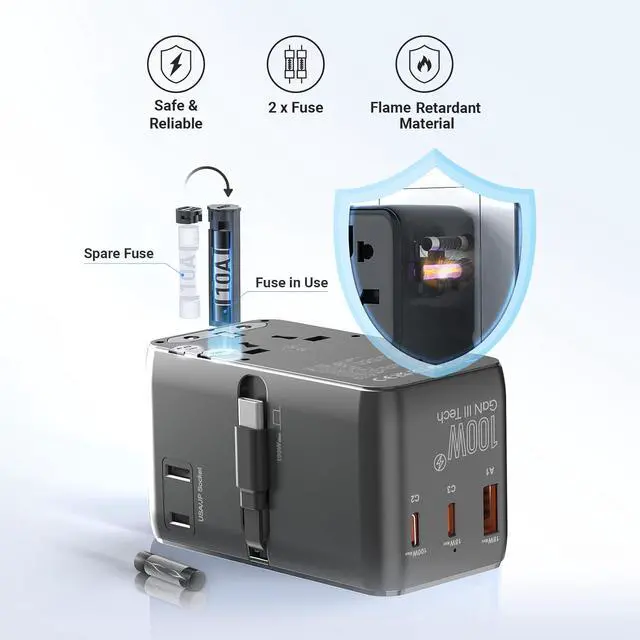 Cable Length: 63cm. Simply pull it out to start charging wherever and whenever you need eliminating the hassle of carrying additional cablesUltra-Fast Charging SpeedExperience unparalleled charging efficiency with the single-port output on USB-C1/C2 capable of delivering up to 100W ensuring your high-power devices are rapidly charged. Single using one USB-C port (C1/C2) can power up your MacBook Pro 16 to 55% in just 30 minutes5 in 1 international power adapterIt features integrated USB charging solutions making it indispensable for global travelers seeking a versatile charging experience. Our all-in-one adapter includes 4 different plugs that cover over 180 countries such as USA Canada Japan UK Ireland Scotland France Germany Italy Spain China Australia Argentina New Zealand etc. (excluding South Africa India) Multi Safety ProtectionOur travel plug adapters have been rigorously tested to ensure they are safe and reliable (Certified by RoHS CE and FCC). And includes built-in protections to guard against overvoltage overcurrent and overheating. Complete with fire-retardant casing for peace of mind while traveling