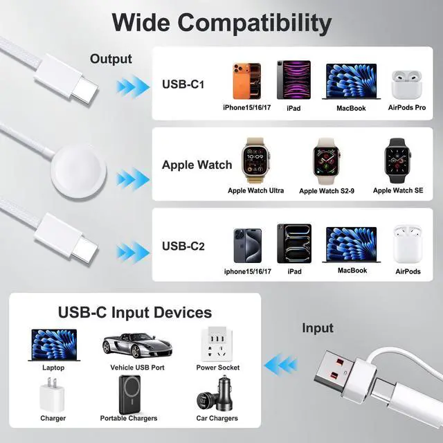 Compatibility & Perfect Travel Essentials]: This 3-in-1 cable is designed for the entire ecosystem and beyond seamlessly charging your iPhone 15/16/17 Watch (all Series SE & Ultra) iPad MacBook AirPods and other USB-C devices. With its 4.9 ft ( 1.5 m) length its the ultimate travel essentialkeeping your devices powered whether youre on a road trip flying internationally cruising camping or working remotely. One cable replaces the clutter
