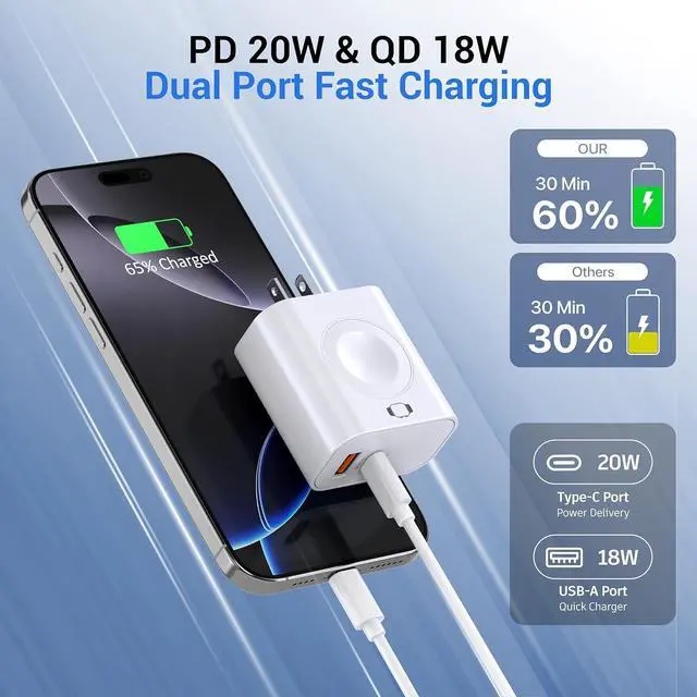 Fast & Efficient Charging: Charge smarter and faster with the iWatch Charger 20W Dual Port USB-C iPhone Charger Block designed to charge your Watch and use as an iPhone fast charger with ease. Featuring a high-speed 20W USB-C port and a versatile USB-A port this compact wall charger charging block lets you charge two devices at onceperfect for your iWatch iPhone AirPods iPad and more.