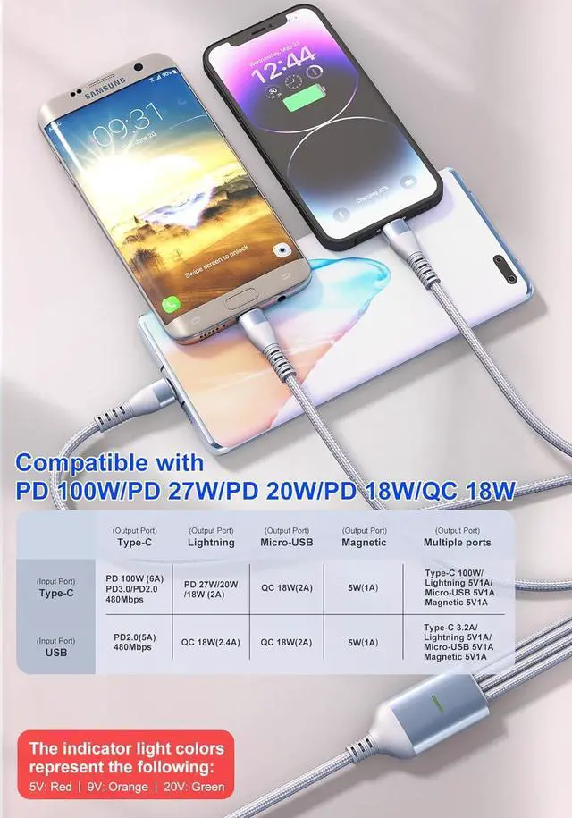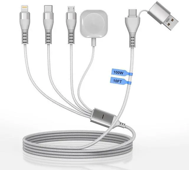 All-in-One Multi Charging Cable for WatchThis 4-in-2 multi charging cable integrates four output ports (100W USB-C 27W Lightning Micro-USB and magnetic Watch charger) with dual input (USB-A/USB-C). MFi-certified and designed to charge multiple devices simultaneously it eliminates cable clutterperfect as a travel essentials kit for home office or on-the-go use. The 10-foot length offers flexibility while charging your laptop iPhone and Watch with ease. 100W PD Fast Charging for High-Speed PowerExperience ultra-fast charging with the 100w multi charging cable USB-C port delivering up to 100W Power Delivery to compatible devices like MacBook Pro iPhone 15 and Galaxy.