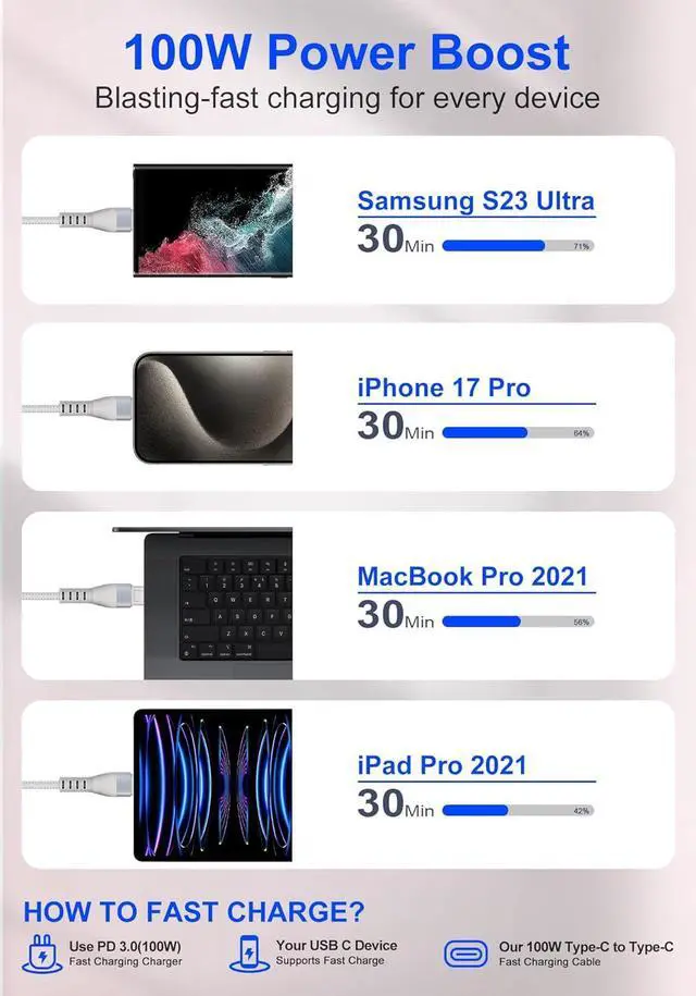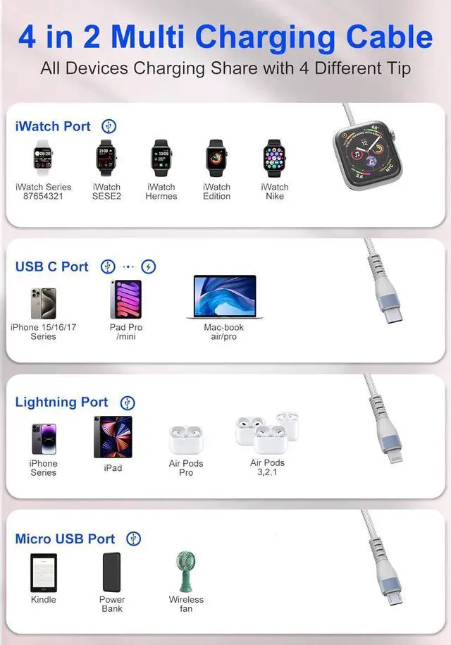 (Note: no iwatch case for better charging speed). Universal Compatibility for Multiple DevicesThis versatile cable supports a wide range of gadgets: the Lightning port works with iPhones USB-C with iPad and MacBook Micro-USB with Android phones Kindle and more. As a multi phone charger its ideal for households with mixed devices. The watch and phone charger integration ensures seamless connectivity across ecosystems and beyond. Durable 10-Foot Cable for Travel and Outdoor UseCrafted with tough nylon braiding and reinforced stress points this 10-foot cable resists tangling pulling and wearlasting 4x longer than standard cables. Lightweight and portable its a must-have travel essentials and camping essentials accessory easily stowing in bags for trips RV adventures or daily commutes while charging all your devices on the go.