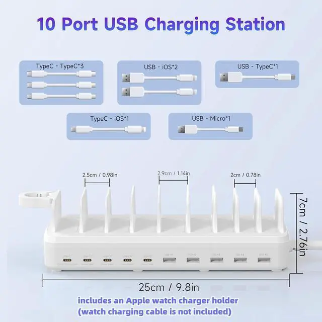 & Space Save: MERGROLY Fast Charging Station is designed with 10 charging ports including 5 USB-C ports and 5 USB-A ports. It can easily store and charge up to 10 devices at the same time and only one MERGROLY mobile fast charging stand can say goodbye to the messy cables and a bunch of wall chargers on the power socket providing you with a neat and comfortable charging space. Powerful PD USB-C Fast Charging PortsOur multi-device charging station is equipped with 1 65W and 4 30W PD USB-C and 5 USB-A fast charging ports which provide lightning-fast charging speeds and can boost your phone's power from 20% to 80% in 30 minutes giving you a more efficient charging experience. It also includes an watch charger holder (watch charging cable is not included).