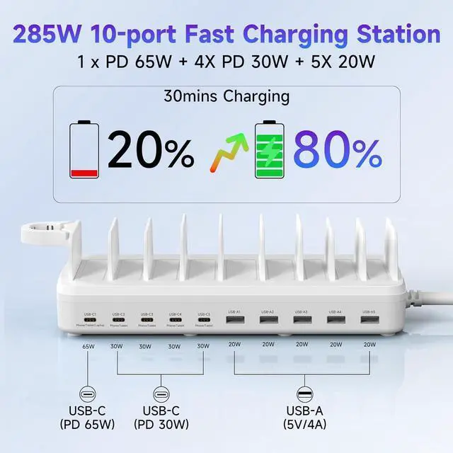 Smart Charging: Our 285W 10 Ports Fast Charging Station not only ensures fast charging but also puts charging safety first. Our charging station has built-in advanced smart chips that can automatically detect devices and provide accurate charging current according to different devices to avoid overcharging and ensure the charging safety of your devices.