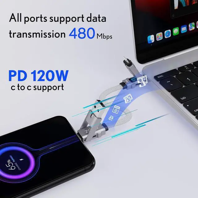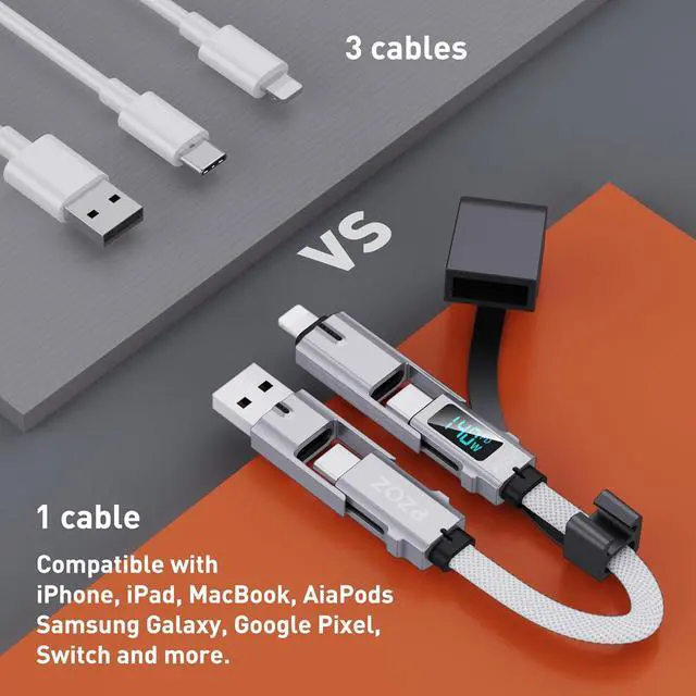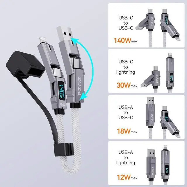 (NOTE: Display module just show charging power)Support 140W Fast Charging & Transfer DataPaired with a 140W power charger supports up to 140W (28V 5A) charging speed. Transfer data up to 480Mbps (sync 1200 songs per minute) (NOTE: Doesn't support video output. )Switching of 4 ModesPaired with a 140W power charger USB C to USB C charging power up to 140W USB A to USB C charging power up to 140W USB C to Lightning charging power up to 27W USB A to Lightning charging power up to 12W. Ultimate DurabilityCharging cable with high-quality zinc alloy and rugged nylon TPU cable guard to make After high-strength and high-frequency bending tests provide you with longer and stronger services. Intelligent chips ensure battery health. Wide CompatibilityWorks effortlessly with any USB-C device including phones tablets and laptops. Compatible with iPhone iPad MacBook AiaPods Galaxy Google Pixel Switch and more. (
