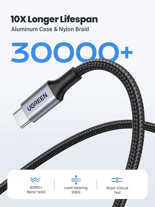 Braided Design: The 100W USB C charger cable has aluminum housing nylon braiding and 250d fiber core which keeps the cable from fraying or splitting while exposed to over 10 000 ninety degree bends or turnsSuper