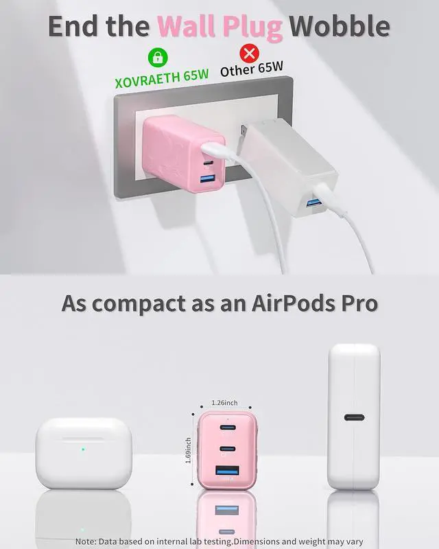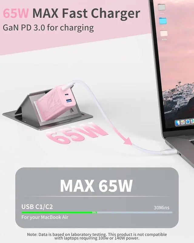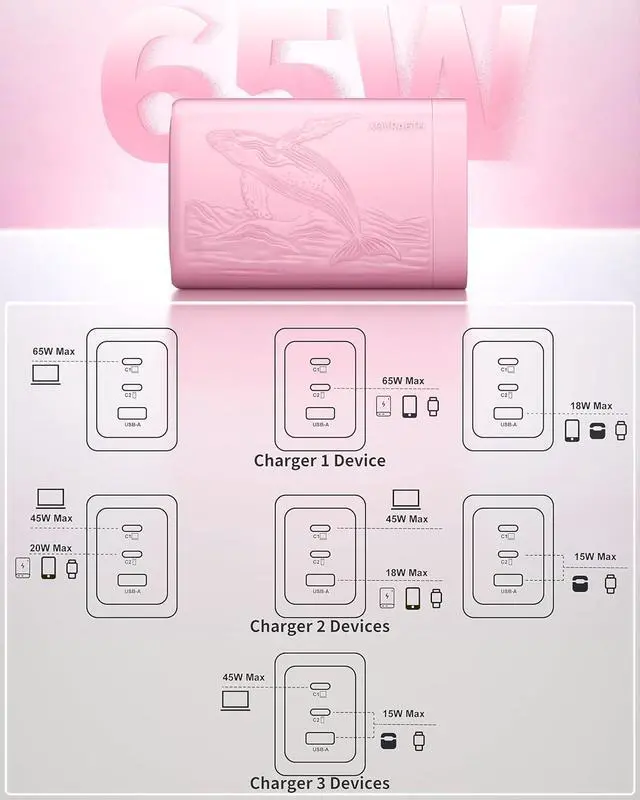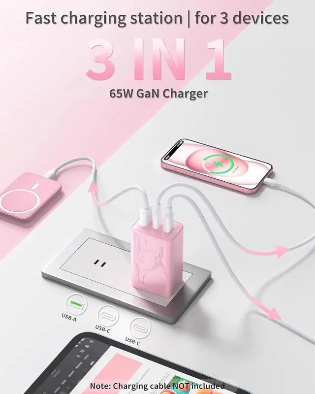 Note: Charging cable not included. 65W High-Speed Laptop ChargingGet up to 65 watts from USB-C1 or USB-C2 when used alonepowerful enough to fast-charge a MacBook Air to 51% in about 30 minutes. This usb-c charger for MacBook Air also provides fast stable power for phones tablets and other USB-C devices. Not recommended for high-power gaming laptops or mobile workstations. Smart Power AllocationThis usb c charger block multiple ports automatically detects connected devices and distributes power efficiently No more worrying about power drop-offs. When all three ports are used the charger automatically allocates poweryour laptop/tablet gets 45W while your phone/earbuds/watch share 15W. Even with multiple devices plugged in charging stays smooth and stable. Unique Design&Compact Folding Plug Designed with an eye-catching orca-pattern embossed finish and a sleek pink color this compact 65w usb c charger stands out from standard white or black chargers. The foldable plug and small body make this 65W USB C charger block about 38% smaller than a typical MacBook chargerroughly the size of an caseso it easily fits into pockets small bags or travel pouches. A practical and stylish travel charger for multiple devices for daily use or travel.