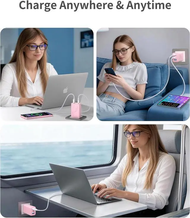 2C1A Triple-Port DesignThis pink 65W USB C charger block is a compact USB C GaN charger featuring 2 USB-C ports and 1 USB-A port allowing you to charge a laptop tablet and phone simultaneously. its ideal for students professionals travelers and anyone using multiple devices throughout the day. Whether at home work or on the go this travel charger for multiple devices helps you stay powered without carrying multiple original chargers.