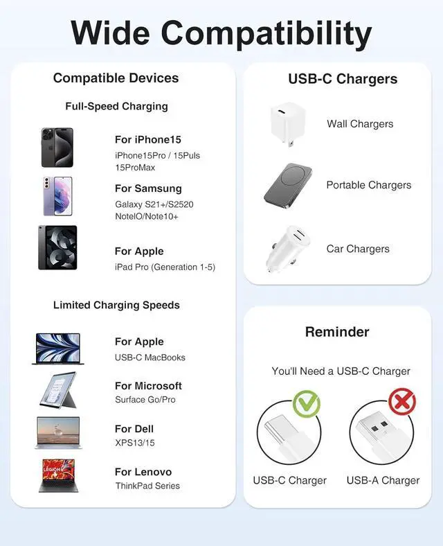 It also compatible with Galaxy S23/S22/S21/S21 Ultra/S21 Plus/note 20/S20/Note 10 /S8 S9 S10 S20 Plus and usb c power bank. One Cable Lifetime ServiceYou will get 3FT*5 60W PD 3.0 USB C to USB C fast charging cable 2-Years worry-free refund and replacement guarantee. if you have any questions please feel free to contact us we have confidence in our products and we are responsible to our customers We promise to solve your problems within 24 Hours.