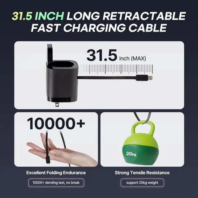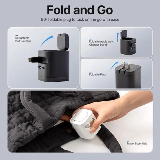 ?? All-in-One Wall Charger for Devices This compact all-in-one charger for devices features a USB-C port a USB-A port a built-in retractable USB-C cable and a built-in Watch charging pad. Effortlessly charge all your devicesiPhone iPad MacBook AirPods and Watchsimultaneously along with other USB-powered devices. Say goodbye to messy cables and multiple adapters; its the ultimate Multiport wall charger for devices?? Innovative 65W USB-C Wall Charger with Retractable Cable & Watch Charging This all-in-one USB-C charging block features a built-in 31.5 -inch retractable fast-charging cable providing the perfect length for daily use while neatly retracting for storage and travel.