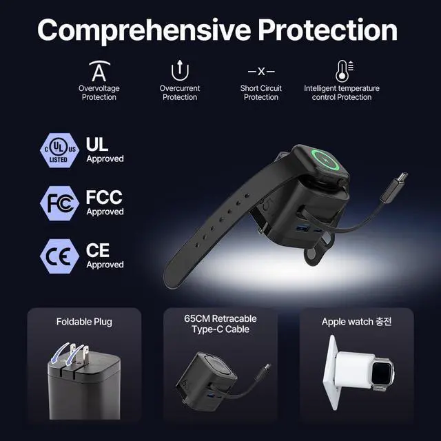 With 65W high-power GaN3 technology it can charge your MacBook laptop tablet smartphone and even your Watch simultaneously. Combining a retractable cable multiple ports (USB-C and USB-A) and a dedicated magnetic Watch charging pad this charger offers a truly innovative all-in-one solutioneliminating the need for multiple chargers and messy cables. Perfect for home office or travel.?? Upgraded Built-in Watch charger iWatch / Watch Charger Stand Wireless Fast Charging Dock with Advanced Magnetic Coils for Safe Quick and Stable Charging Works with Watch Series 9 8 SE 7 6 5 4 3 2 1 (All Sizes).