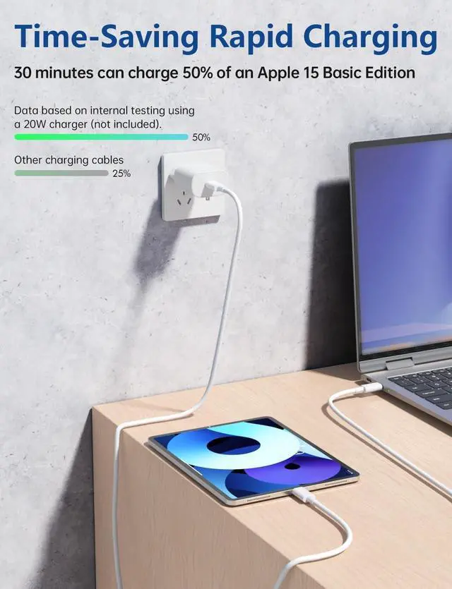 Sync: C to C Cord That Powers & Speeds?? ---- Charge faster sync smarter. This USB-C to USB-C Charger Cord supports PD 3.0 protocols (up to 60W Max) so your iPhone 17/16/15 charges from 0% to 50% in 30 minutes. Need to transfer a 4K video? With 480Mbps data sync speeds its done before you finish your coffee. Works with all?? USB-C Power Delivery adapters?? (20W60W) from phone chargers to laptop adaptersUniversal C to
