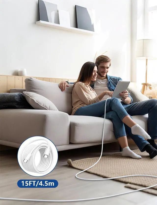 Extra Reach: C to C Cord That Follows Your Moves?? ---- No more cable chase! This 15ft USB-C to C Cable gives you the freedom to charge while you work stream or relax. Lounge on the couch with your phone work at a cluttered desk or charge your laptop in a hotel roomthis long C to C Cord reaches farther so you dont have to move closer to the outlet. The flexible non-tangling design coils easily ready for your next use60W Fast Charging + 480Mbps