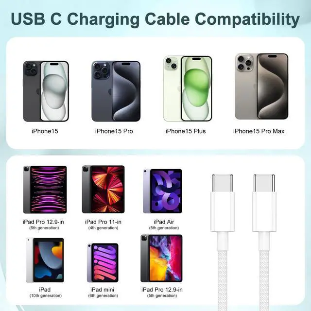 Right for ALL Your USB C DevicesThis is the USB-C to USB-C cable Not the USB-C to USB-A cable Compatible with virtually all USB-C devices including phones tablets and laptops. Such as iPhone 17/17 Air/17 Pro/17 Pro Max/iPhone 16/16 Plus/16 Pro/16 Pro Max/iPhone 15/15 Plus/15 Pro/15 Pro Max iPad 10rd Gen 2022 iPad mini 6th Gen 2021 iPad Pro 12.9 inch 6th/5th/4th/3rd Generation 2022/2021/2020/2018 iPad Pro 11 inch 4th/3rd/2nd/1st Generation 2022/2021/2020/2018 iPad Air 5th/4th Gen 2022/2020. It can also fast charge for USB C enabled smartphones and Type-C phones and tablets. What you get2 pieces iPhone 17 16 15 USB C cables If you have any questions about our iPhone cable please feel free to contact us.
