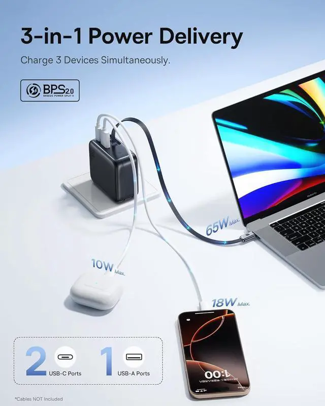 100W Ultra Fast Charging: Supports full-speed 100W fast charging for laptops such as MacBook Pro/Air charging a MacBook Pro 14 M4 Pro up to 54% in just 30 minutes when single conect it also can power up two macbook air simultaneously.