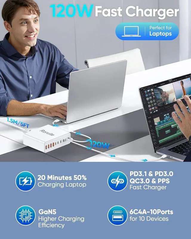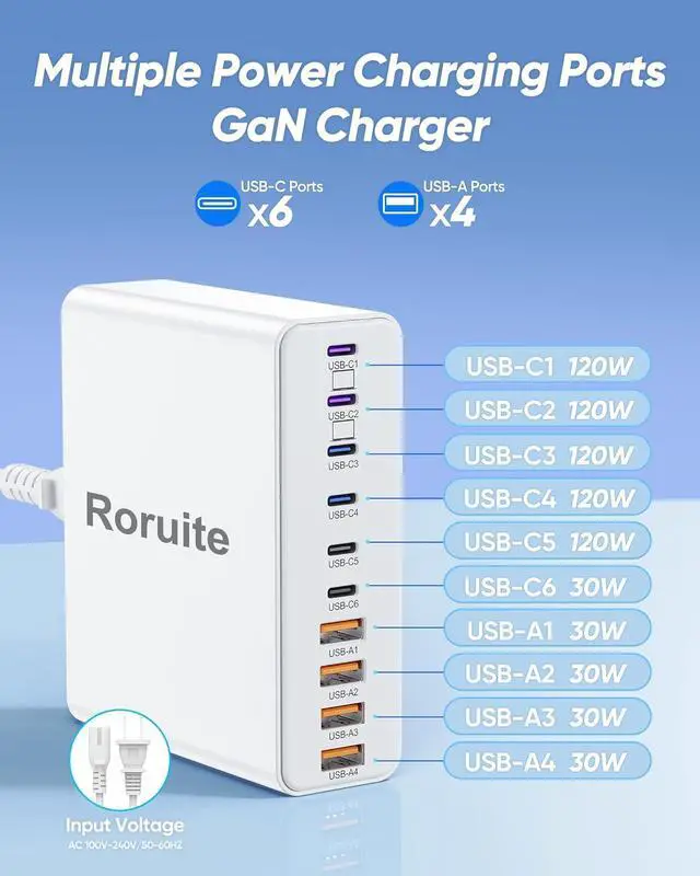 800W Multiport USB C & A Charging Station This 10-port USB-C charger block from Roruite is the ultimate charging solution for multiple devices. Equipped with 6 USB-C charging ports and 4 USB-A charging ports it features intelligent power distribution that quickly formulates the shortest charging plan for youpowering up all your devices at the fastest possible speed with no waiting time. Notably our 120W super fast charger is 3x faster than a regular 65W charger. 10-in-1 Multi-Device Super USB Charging Hub This upgraded USB-C Charging Station features 5×120W PD USB-C Super Fast Charging ports 4×30W QC USB-A Fast Charging ports and 1×30W PD USB-C Fast Charging port.