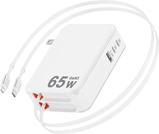 3.9FT Longest Retractable CableIs the retractable line too short? Jasput upgraded 5 in 1 retractable wall charger with dual cables(a 65w USB-C Cable a 12w Light ening cable) both 1.18 m/ 3.9 ft long. It is one of the longest retractable chargers for multiple devices. It is also equipped with a 12W USB Port and two 15W USB-C Ports to meet your need. GaN3 TechnologyRetractable charger usb c adopts GaN3 technology the charging efficiency is increased by 60% and the heat generation is lower. It is equipped with an intelligent chip supporting overvoltage overcurrent short circuit over-temperature and other protections.