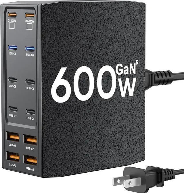 12-in-1 USB C Charging StationThis 600W USB C Charger Block comes with 8 USB C ports and 4 USB A ports to charge multiple devices simplify your charging setup and let you experience the convenience of ultra-fast and ultra-high output charging. With its smart charging technology it can automatically detect and provide the best power output for each connected device ensuring fast and efficient charging. Universal CompatibilityOur USB C charging station is equipped with 2*100W and 2*65W fast charging ports which can charge 3 or more laptops at the same time. Compatible with smartphones tablets and laptops suitable for MacBook Pro/Air XPS iPad Pro Phone 16/16 Pro Max Phone 15 Pro Max Phone 14/13 Pro/12 Pro Max iWatch AirPods Surface Pro Galaxy S24 Ultra Switch Steam Deck Google Pixel and many other devices.