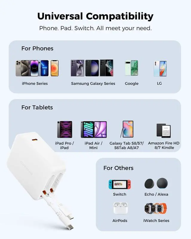Reliable: SUPERONE USB C Charger Block is equipped with advanced Gallium Nitride (GaN) technology to achieve fast charging and reduce power loss and heat. Intelligently matches safe current required whether it is daily use or playing games it can maintain stable performance and the best device experience. In addition built-in protections against overcharging overcurrent and short circuits provide comprehensive safety for worry-free charging.?? Universal