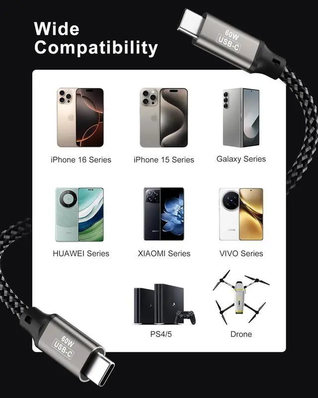 This USB C Cable can fast charge and sync well compatible with PS5 wireless controller Galaxy S20/S20+ Ultra S10 S9 S8 Note 20 10 A51/A50/A12/A11 iPhone 16/16 Pro/16 Pro Max/16 Plus/15/15 Plus/15 Pro/15 Pro Max Moto Z/Z2 LG G5/G6/V20/V30 and other USB-C devices.