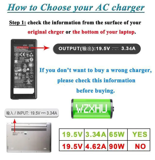 • Output: 19.5V 3.34A 65W, Input: 100-240V 1.5 A 50-60Hz, Connector tip: 7.4mmx5.0mm round tip