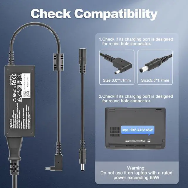 • Power Specs: Input: AC 100-240V, 50-60Hz; Power: 65W; Output: 19V 3.42A; Connector: 3.0 mm*1.1mm