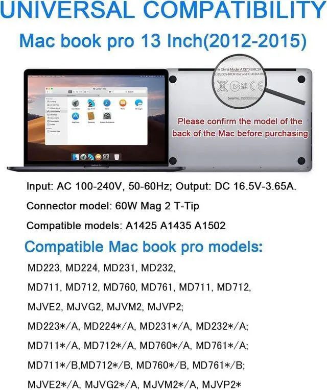 Compatible with Mac Book laptops: Note: Please check the model of the laptop before purchasing. Suitable for laptop power supply models: A1425, A1435, A1502, A1466, A1436, A1465. Compatible with Mac Book Pro 13 inches: MGX72, MGX82, MGX92, MF839, MF840, MF841, MF843, MD212, MD213, MD662, ME864, ME865, ME866. Compatible with Mac Book Air 11 inches and 13.3 inches: MD223, MD224, MD3231, MD217, MD172, MD760, MD761, MJVM2, MJVP2, MJVE2, MJVG2, MQD32, 42, 52