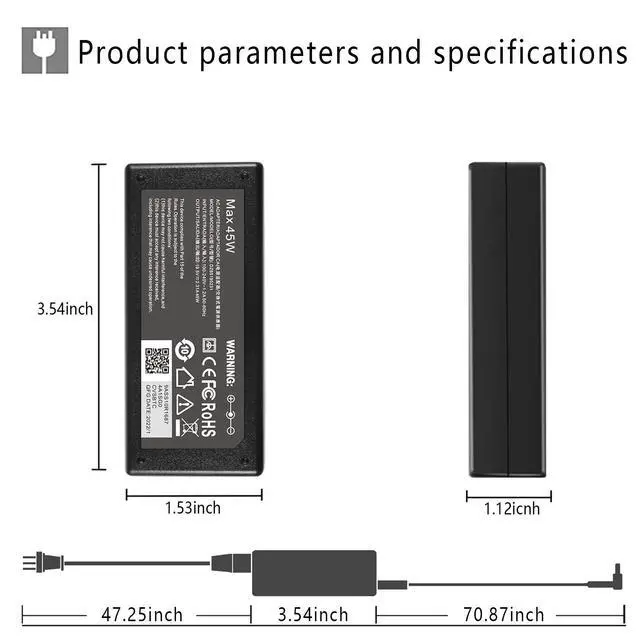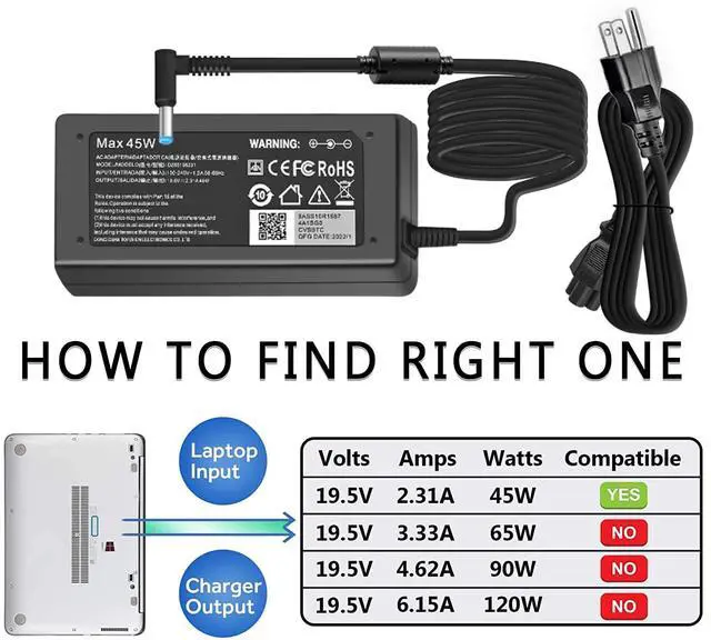 • Power SpecsInput: AC 100-240V-1.2A 50-60Hz Output: DC 19.5V-2.31A 45W (NOT 65W!! PLEASE CHECK!) Connector Size: 4.5 x 3.0mm