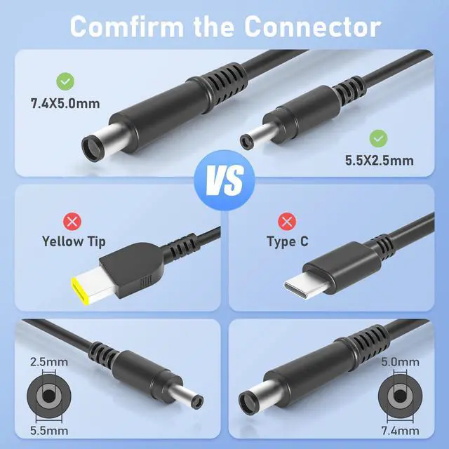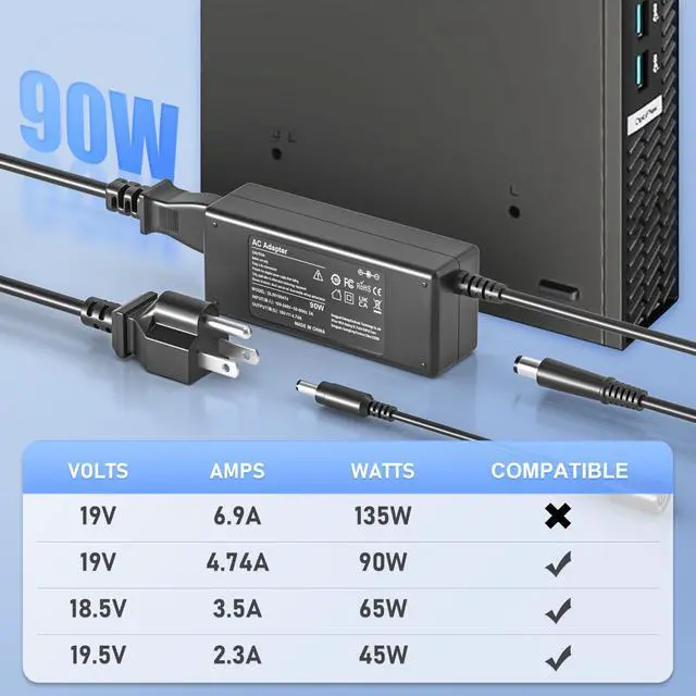 Upgraded All-in-One Power Cord: This replacement AC adapter power cord charger is the new version for 2025. Our power cord is compatible with 90W 19V 4.74A and 65W 18.5V 3.5A chargers via 7.4*5.0 tip and 5.5*2.5 tip, meeting the power requirements of various desktop computers. (Note that it is not compatible with the 135W model)