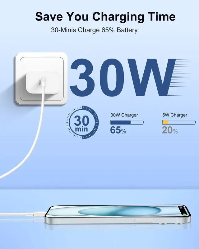 Design for iPhone 15/16/17 iPad/Google 30W output can save you about 1 hour compared to a 20W charger, fully charging iPad Pro 12.9 inches in 2 hours and 30 minutes. Maximum speed charging is available for various devices, including iPhone 17 / Air / 16e / 16 / 15 Pro Max/ Plus, iPad Pro 12.9 inches Gen 5/4/3, iPad Pro 11 inches Gen 3/2/1, iPad Air 13/11 inches 2025, iPad 11th/10th generation, iPad Mini 6, Google Pixel devices, Samsung Galaxy, and more USB C devices.