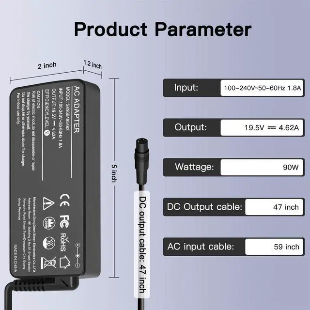SPECIFICATIONSThis universal computer charger has an input voltage range of 100-240V with an output voltage range of 16V, 18.5V, 19V, and 19.5V, delivering a maximum power of 90W. It is compatible with a wide range of laptop brands and models thanks to the different tips provided.