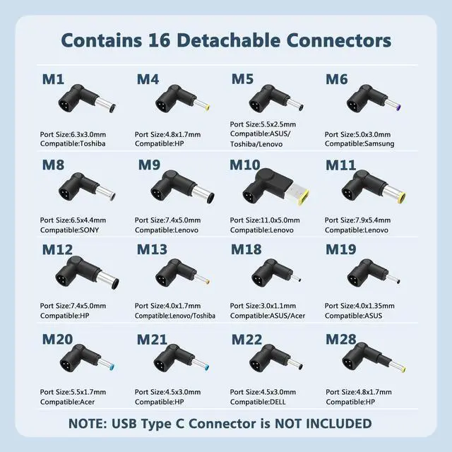 Package Content: 1x 90W Universal Laptop Charger, 16 DC Connector Plugs. Please note that USB Type C and 2.5*0.7mm connectors are NOT included.