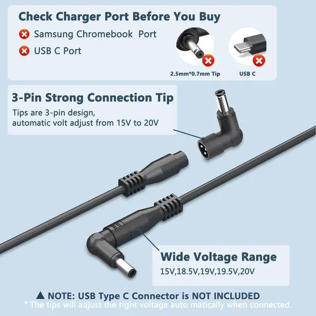Wide output voltage: 15V-20V, Input Voltage: Worldwide 100-240V, 50 - 60Hz. Output Voltage: DC 15V, 16V, 18.5V, 19V, 19.5V, 20V, 16 Connector Types. Perfectly compatible with 90W, 75W, 70W, 65W, 45W, 40W, and 33W laptops. If you are not sure about the connector size, please verify with your laptop model before purchasing.