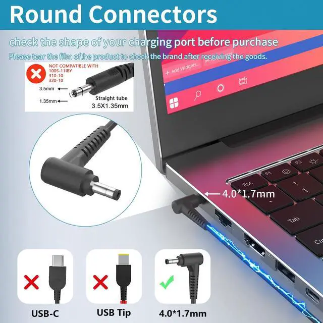 Please note: The interface of this product is 4.0X1.7 mm, which is only suitable for laptops with 4.0X1.7 mm. Cannot use laptops with yellow square tip, 3.5X1.35 mm cylindrical shape, and USB Type-C interface