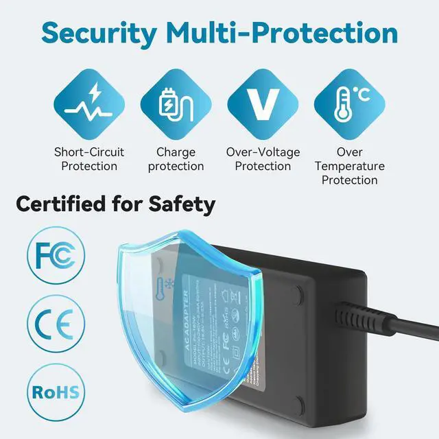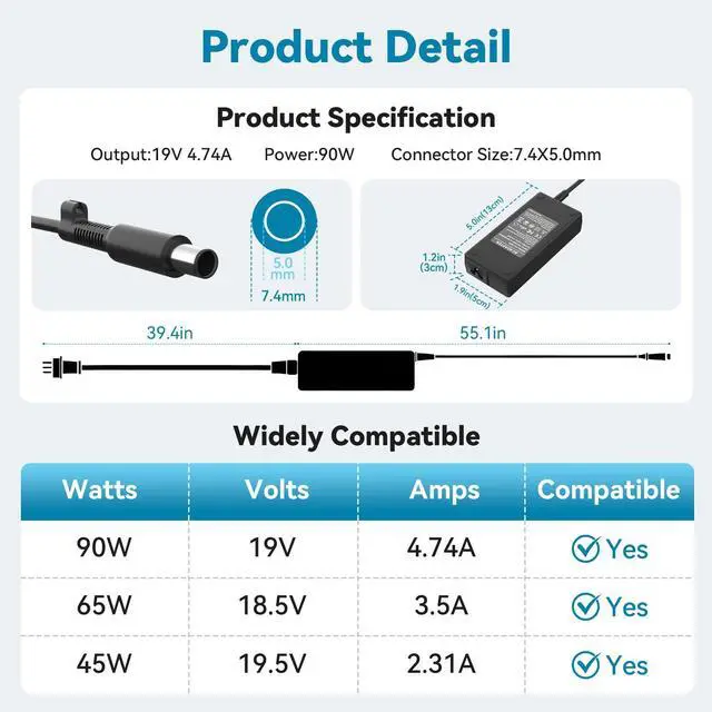 Output DC: 19V 4.74A 90W (Also Compatible With 18.5V 3.5A 65W), AC Input: 100 - 240V 50 - 60Hz, Connector size: 7.4X5.0mm. (Please refer to the picture to confirm your connector size before purchase)