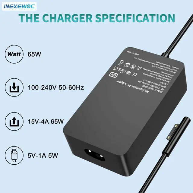 65 Watt Surface Laptop Charger Input: 100-240V 50-60Hz, Output: 15V- 4A 65W; USB Port: 5V-1A 5W; Compatible with various Surface devices including models 10, 9, 8, 7/7+, 6, 5, 4, 3, and X, as well as Surface Book 3/2/1 and Surface Go 3/2/1.