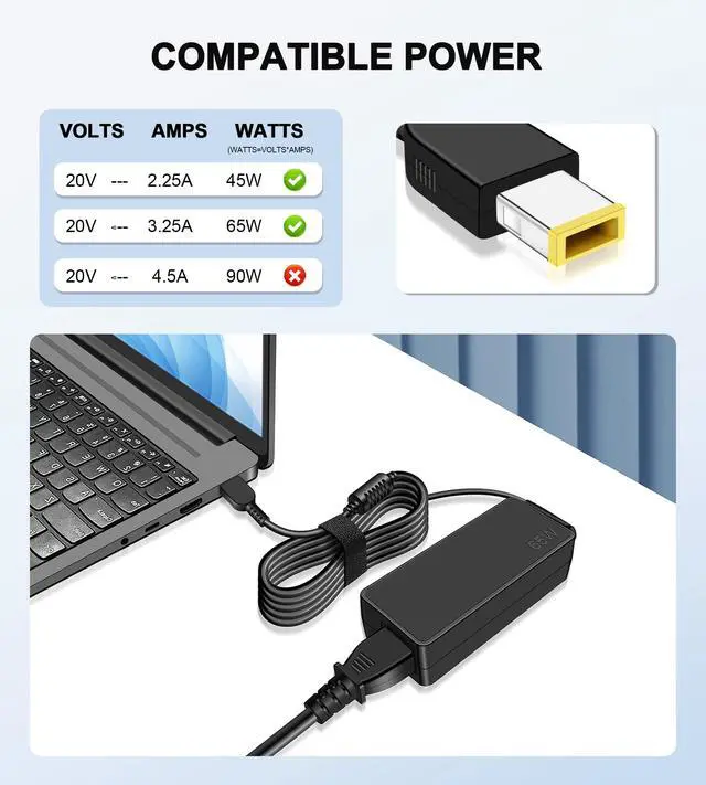 Input: 100V-240V 50/60Hz, Output: 20V-3.25A 65W, Connector Type: Yellow Square Tip (Not a USB-C). The 65W Power Adapter Charger is also compatible with 20V-2.25A 45W laptops.