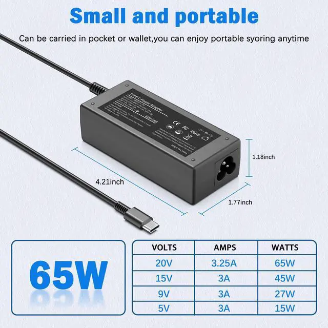 Computer Charger USB-C: Watt: 65W 45W Input: 100-240V 1.5A 50-60Hz Output: 5V-3A or 9V-3A or 15V-3A or 20V-3.25A, Connector: USB Type-C; Compatible with all USB-C laptops.