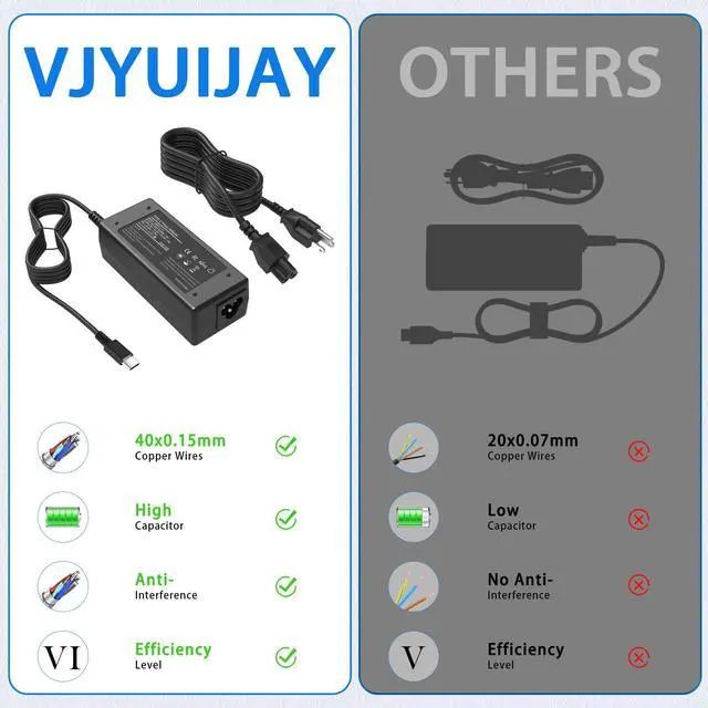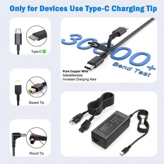 USB-C Laptop charger compatible with ThinkPad T470, T480, T490, T590, X1 Carbon, and others. Additionally compatible with Yoga series and other models.