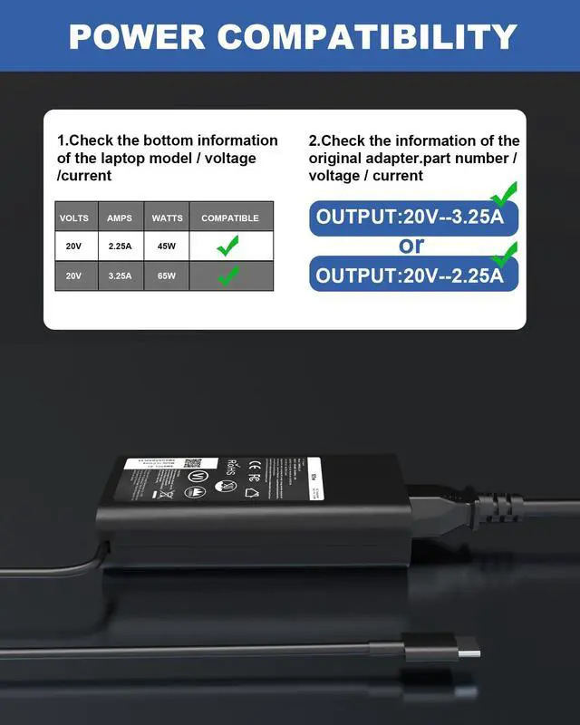 65W USB C Laptop ChargerInput: 100-240V~50-60Hz. Output: 5V-3A, 9V-3A, 12V-3A, 15V-3A, 18V-2.5A, 20V-3.25A (65W Max). Connector: USB Type C Charger.