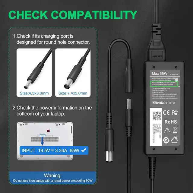 65W Laptop Charger SPECIFICS: 100% Brand New; Power: 65W; Output: 19.5V 3.34A; Input: 100-240V 50/60 Hz, Connector size: 4.5mm x 3.0mm and 7.5mm x 5.0mm. (Note: Please make sure the output and tip size of the AC adapter are compatible before you buy)