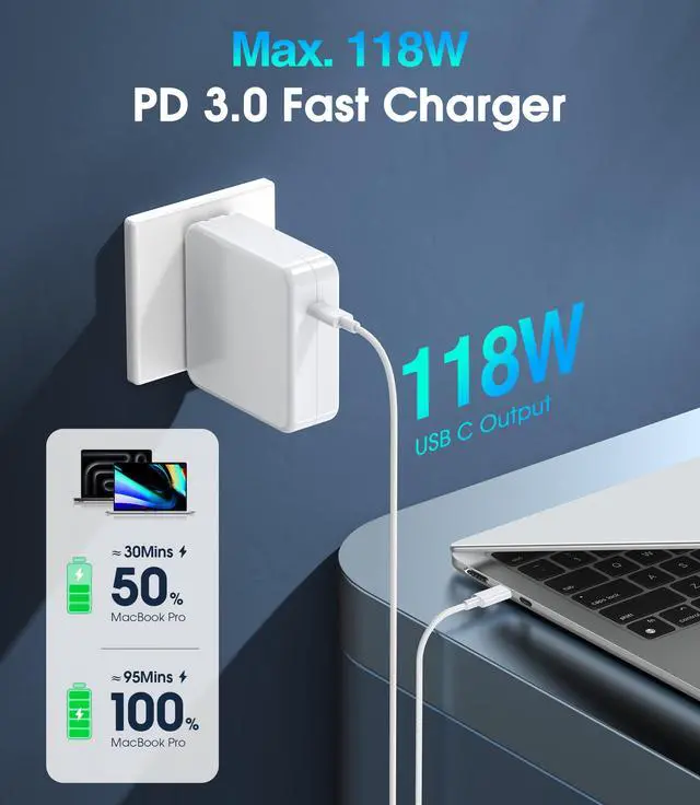 Super Fast Charging: Our 118W USB-C charger utilizes PD 3.0 fast charging technology with an efficiency of up to 98%. It can fully charge a 16-inch MacBook Pro in approximately 1 hour and 25 minutes and can charge a cell phone from 0% to 80% in just 20 minutes, significantly reducing charging time and enhancing usage efficiency.
