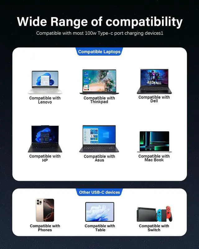 Ultra-Wide Compatibility: Compatible with multiple laptop models and Android smartphones, ensuring optimal power output for efficient charging.