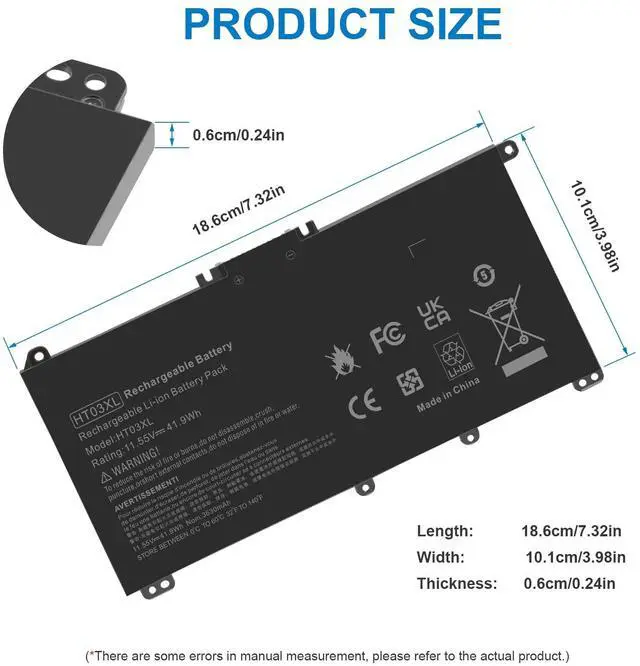 This product is designed to replace specific part numbers: HSTNN-DB8R, HSTNN-DB8S, HSTNN-IB80, HSTNN-IB8O, HSTNN-LB8L, HSTNN-LB8M, HSTNN-UB7J, HT03041XL, HT03XL, and various others listed.