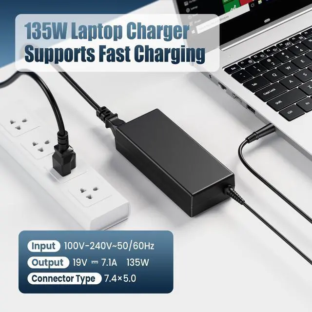 • Input: 100-240V 50-60Hz; Output: 19V 7.1A 135W; Connecter size: 7.4 mm outer diameter / 5.0 mm inner diameter (Note the reference image interface)
