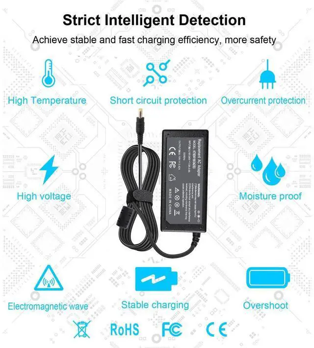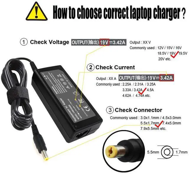 SPECIFICATION: DC Output 19V 3.42A, Input 100-240V 50-60Hz, Power: 65W, Connector barrel Size: 5.5*1.7mm, 3 prongs, Color black, weight about 0.75 lb, Cord length: About 47.24 inches AC power cord, 70.88 inches DC power line. It is important to check your old adapter before finding out these features (output, input, connector size, etc.).