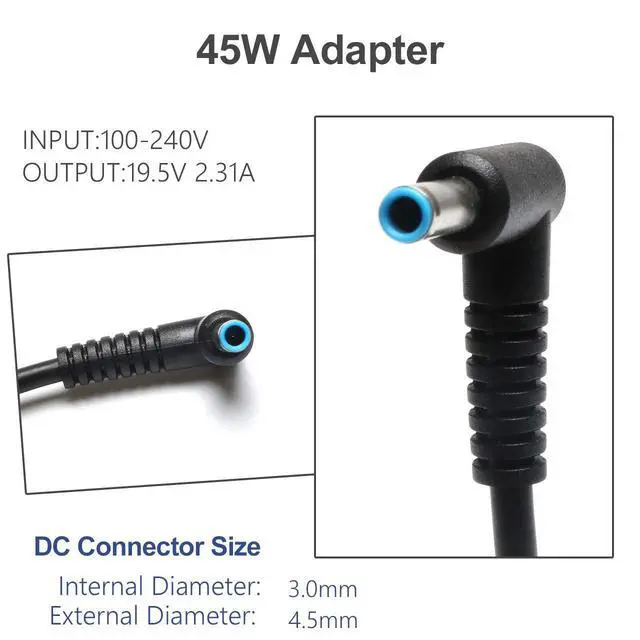 • Output: 19.5V 2.31A 45W; Input: 100-240v~1.1A 50/60hz (Worldwide AC Input); Connector: 4.5mm*3.0mm