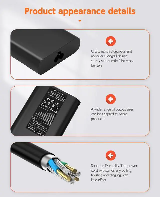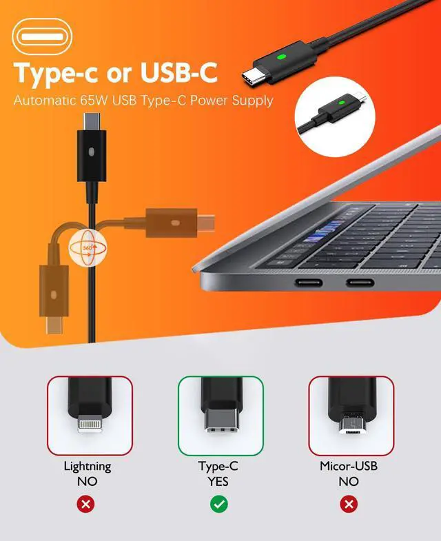 Delivers efficient power with Input: 100-240V 50-60Hz; Output: 5V-3A 9V-3A 12V-3A 15V-3A 18V-2.5A 20V-3.25A 65W Max. USB Type-C(USB-C) Laptop Charger, ensuring fast and stable charging for your device.