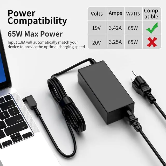 Specification: Connector Tip Interior diameter: 3.0mm x 1.1mm, Output: 65W 19V 3.42A, Input: 100-240V, 50-60Hz. Please check the connector picture.